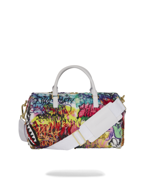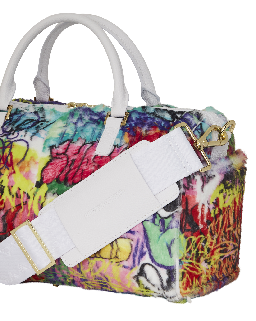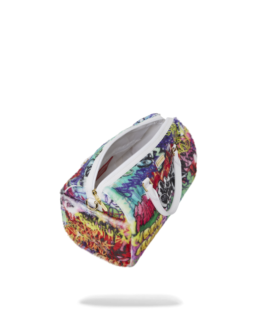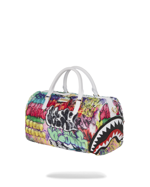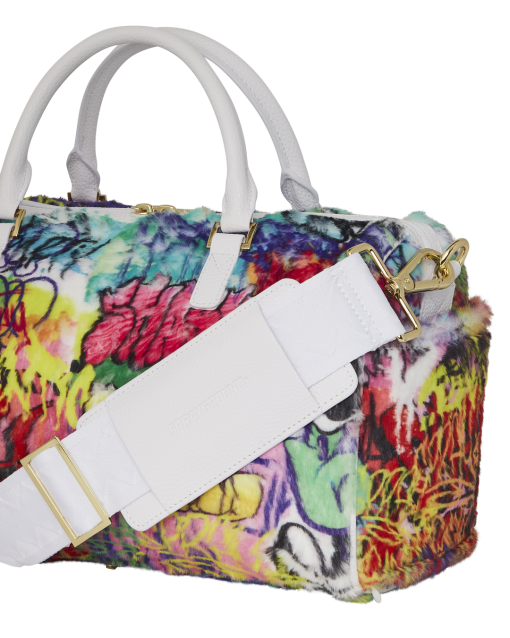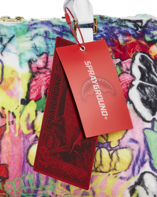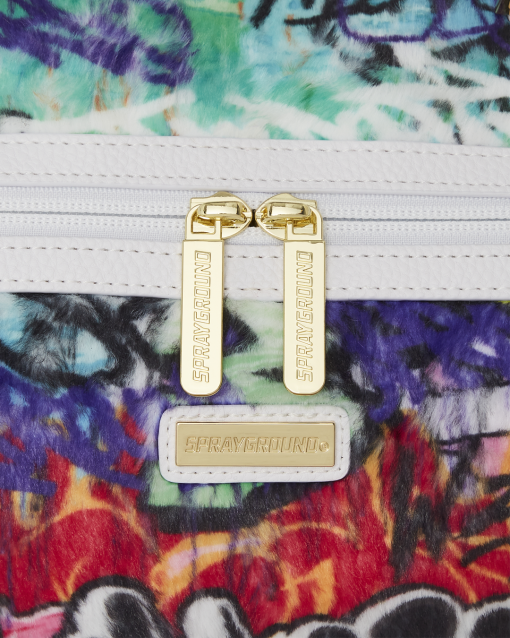 Plush faux fur fabric printed with iconic sprayground graffiti