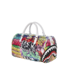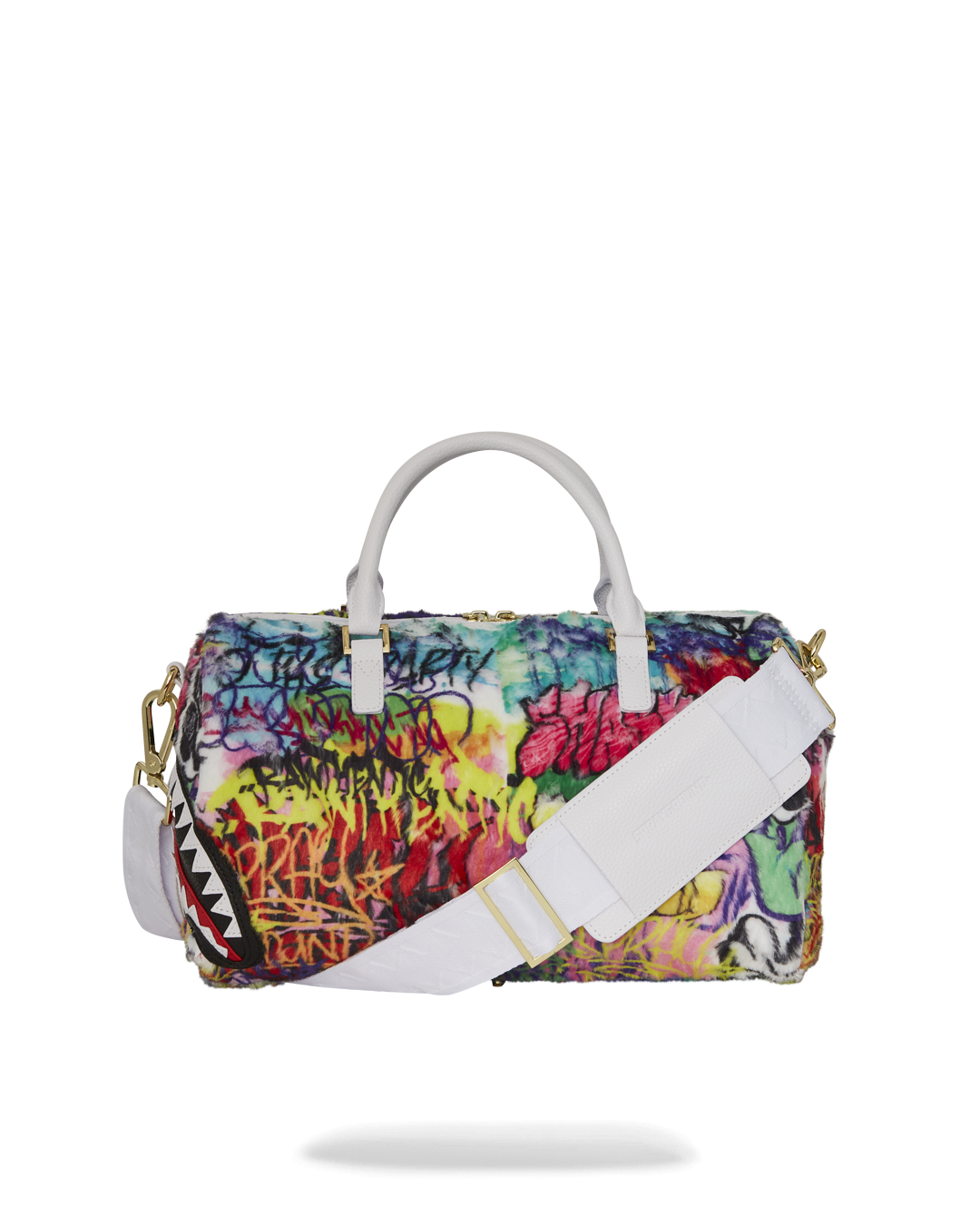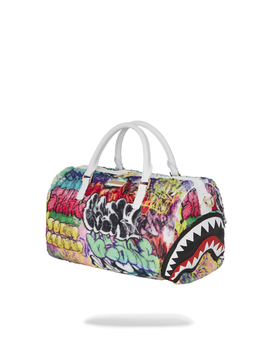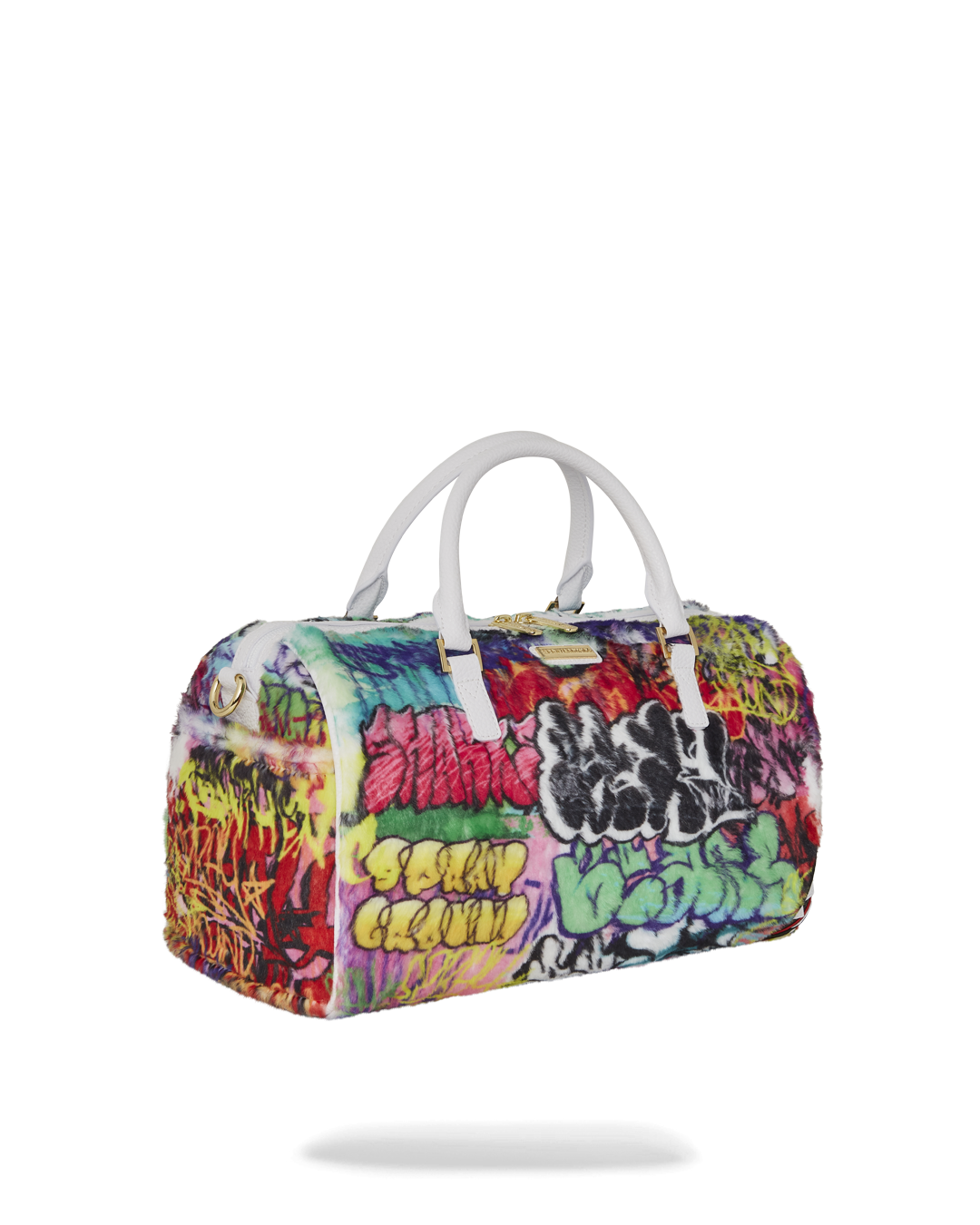 Plush faux fur fabric printed with iconic sprayground graffiti